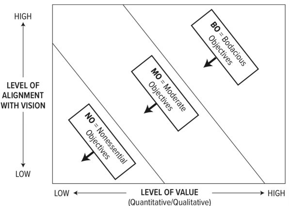 If you want to try this exercise – see my framework in the attached image. Be candid with yourself and see which of your objectives measure up to be a BO, vs a MO vs a NO. Y Axis is Vision Alignment – low to high. X Axis is Relative Value – low to high.